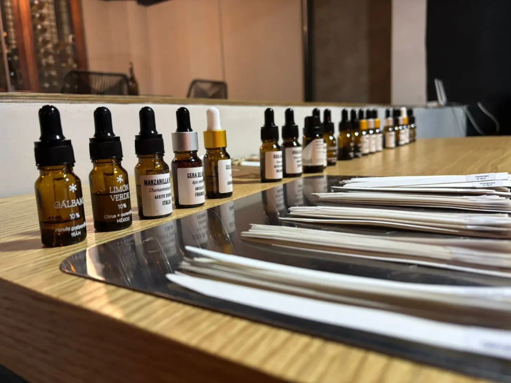 Los participantes entrenaron su nariz con ingredientes de alta especialidad —como rosas de diferentes orígenes, maderas nobles, especias y absolutos florales—, profundizando su capacidad de percibir, identificar y describir los matices de cada copa.