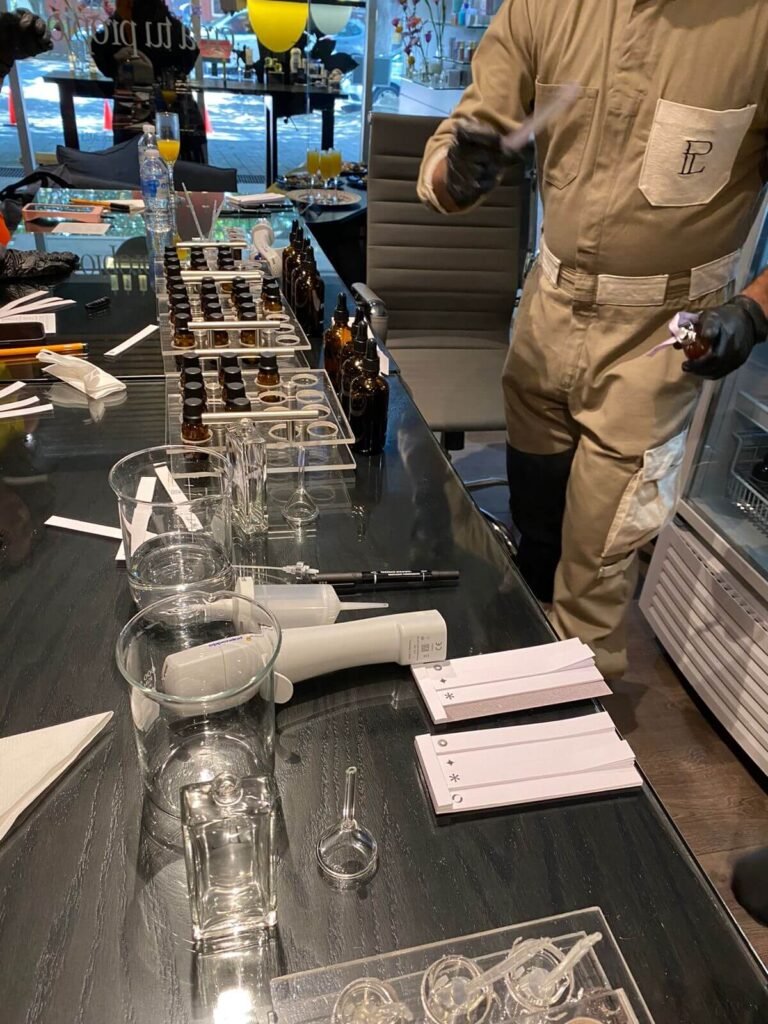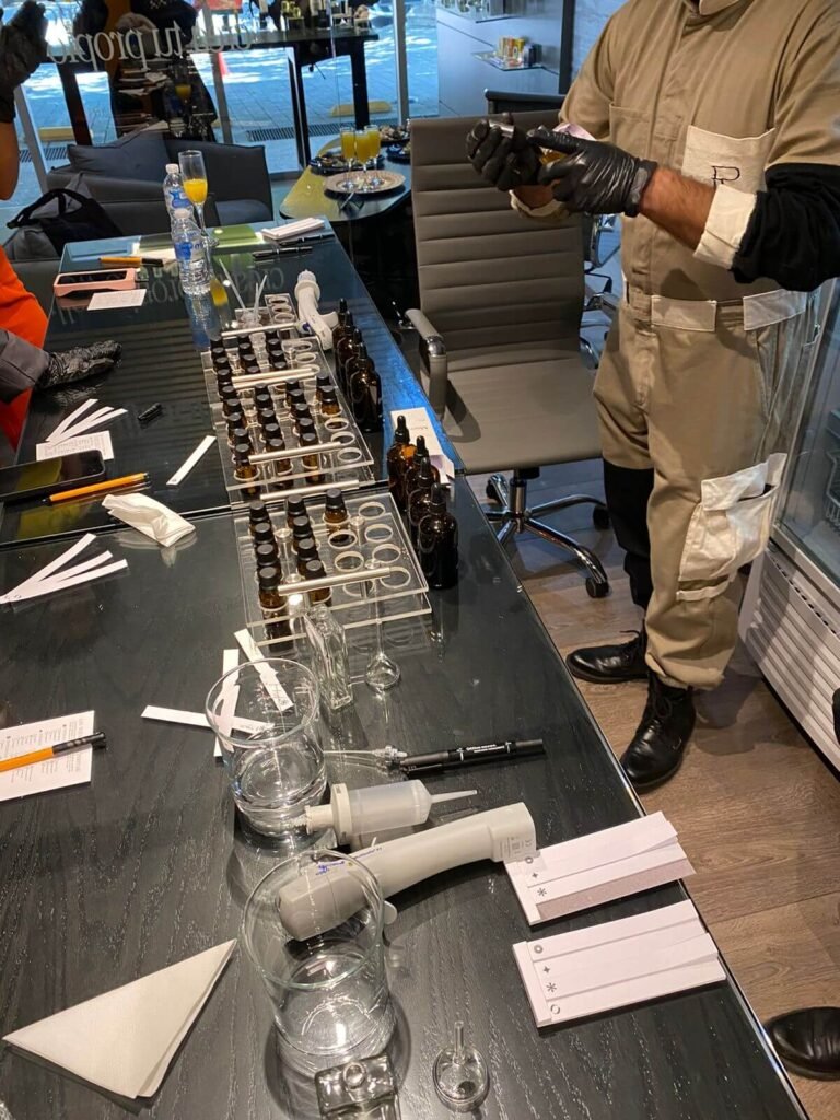 Complementando este obsequio, se llevaron a cabo catas olfativas escalonadas en pequeños grupos, diseñadas como talleres breves de entrenamiento olfativo. En cada sesión, los participantes exploraron materias primas naturales y sintéticas utilizadas en perfumería, aprendieron a identificar notas olfativas clave y descubrieron cómo se construyen las fragancias que nos acompañan en el día a día.