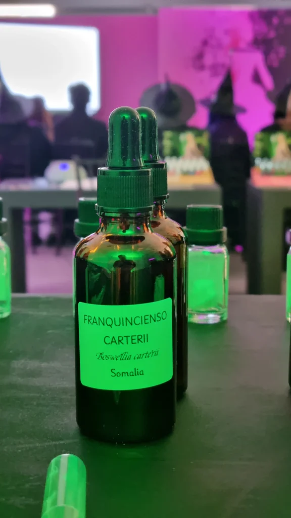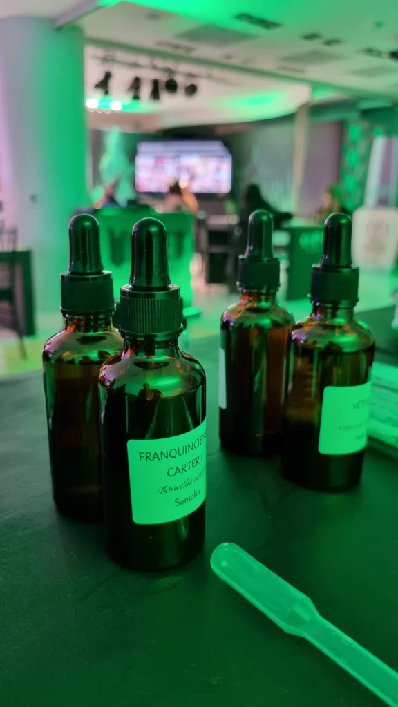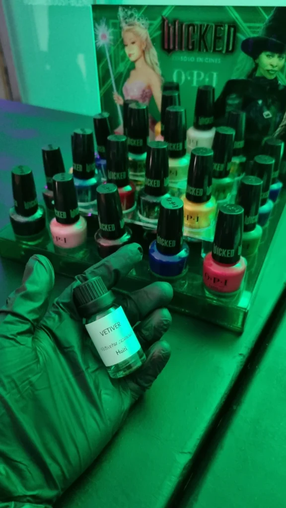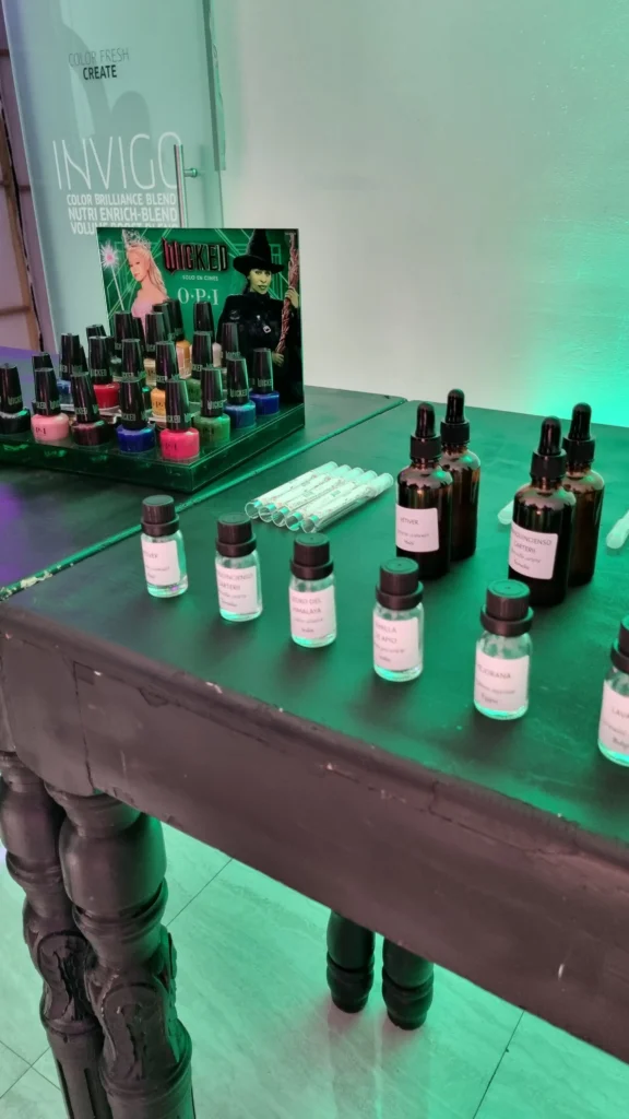A lo largo de dos jornadas, la barra se activó en formato libre, permitiendo a cada persona acercarse a su ritmo y formular su fragancia personalizada guiada por un perfumista. Las materias primas, agrupadas en notas de salida, corazón y fondo, fueron curadas cuidadosamente para evocar las dualidades que representan a ambos personajes: lo enérgico y disruptivo de Elphaba, y la luminosidad etérea de Glinda.