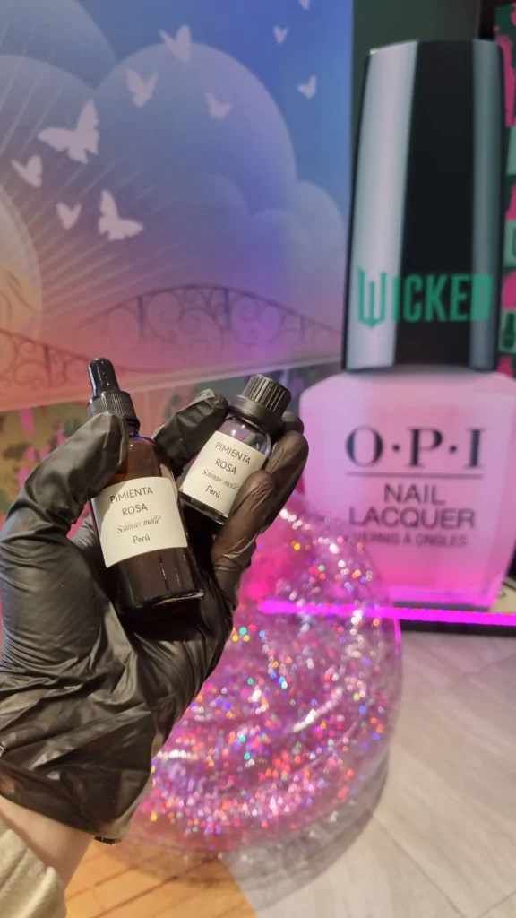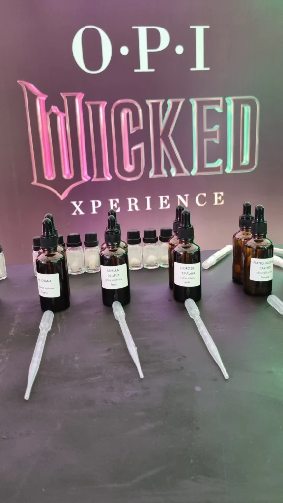 Para celebrar el lanzamiento de la nueva línea de esmaltes inspirada en Wicked, diseñamos una experiencia sensorial interactiva donde los asistentes crearon su propio perfume en una barra de blending olfativo, inspirada en los personajes de Elphaba y Glinda.
